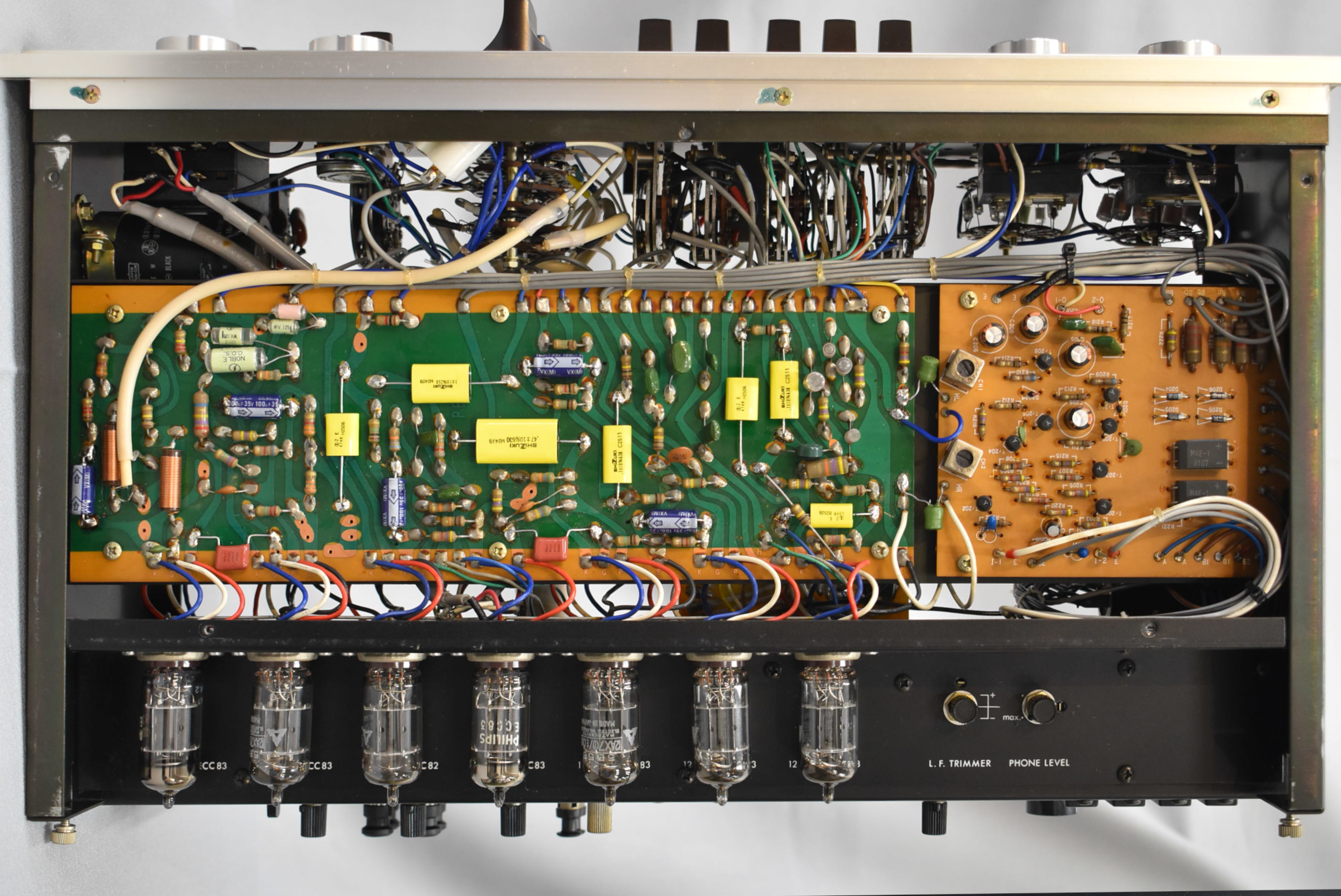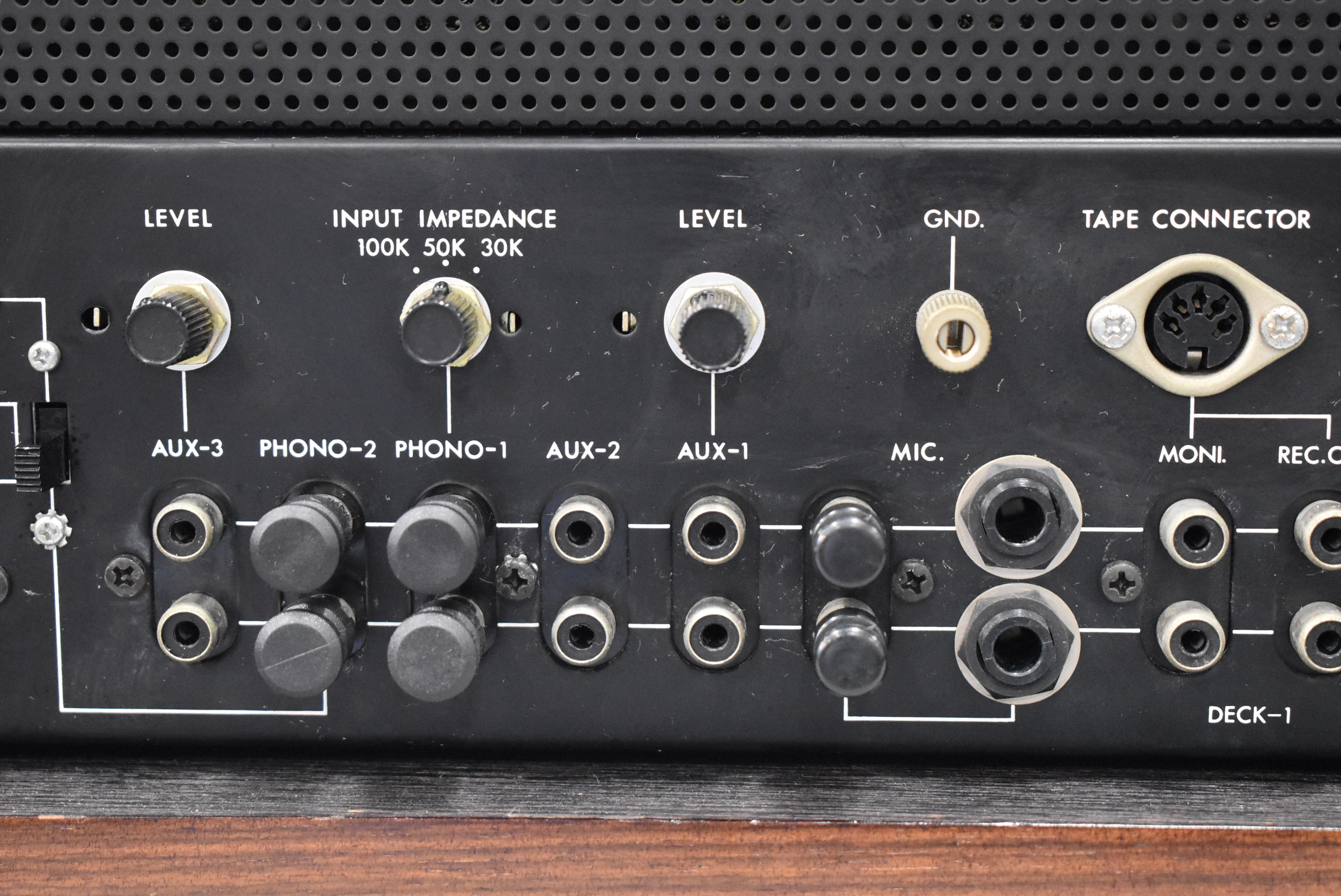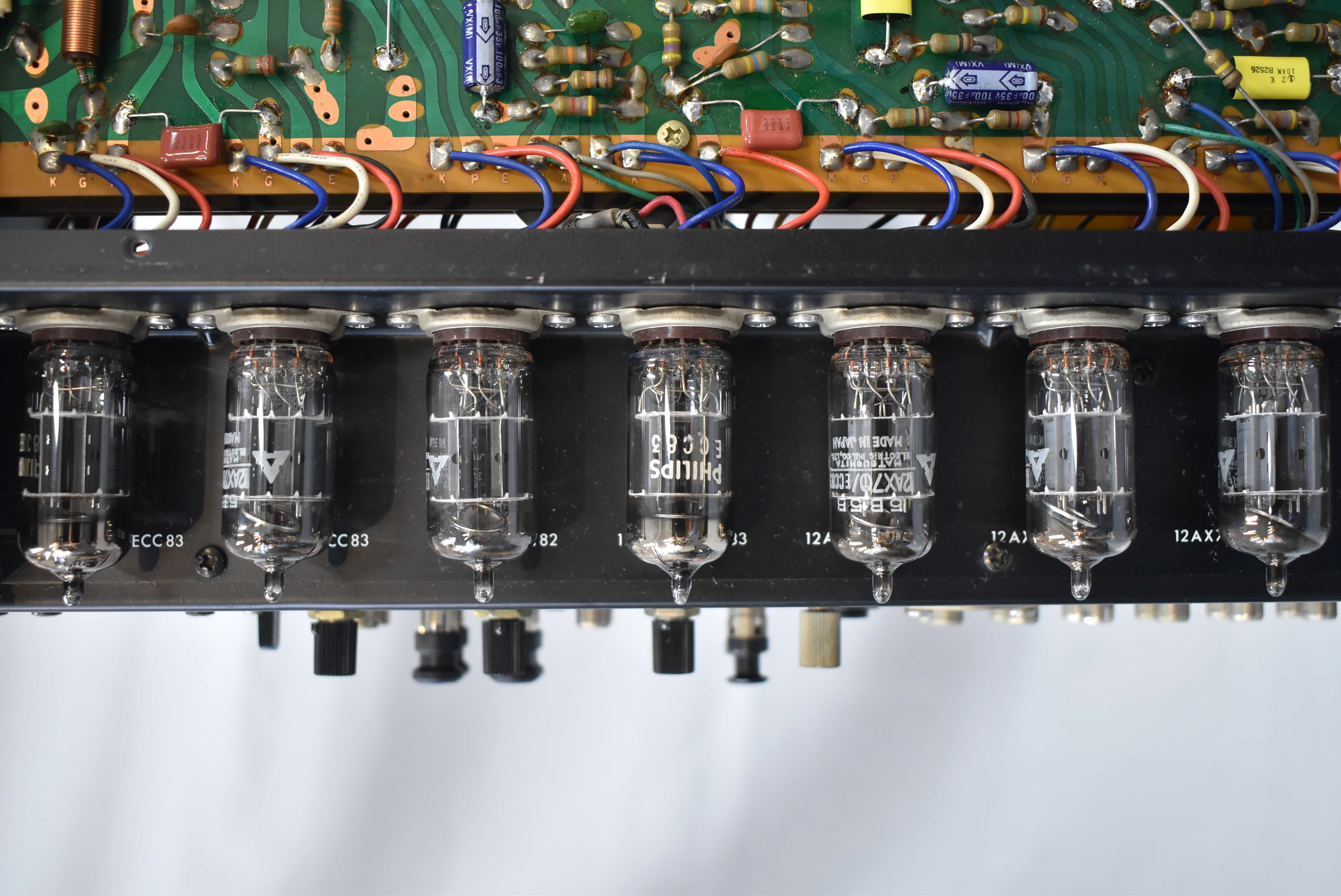 | 仕様 | ■型式:管球式コントロールアンプ ■周波数特性:15Hz~40kHz(-1dB) ■全高調波歪率:0.06%以下(出力2V) ■出力電圧:最大15V(歪率0.3%) ■出力インピーダンス:550Ω ■入力感度:PHONO1,2-2mV AUX1,3-120mV(可変) AUX2-120mV MIC-0.5mV ■SN比:PHONO-64dB以上 AUX-77dB以上 MIC-60dB以上 ■トーンコントロール:LUX方式NF型湾曲点切換付 ■使用真空管:12AX7×6本 12AU7×1本 |