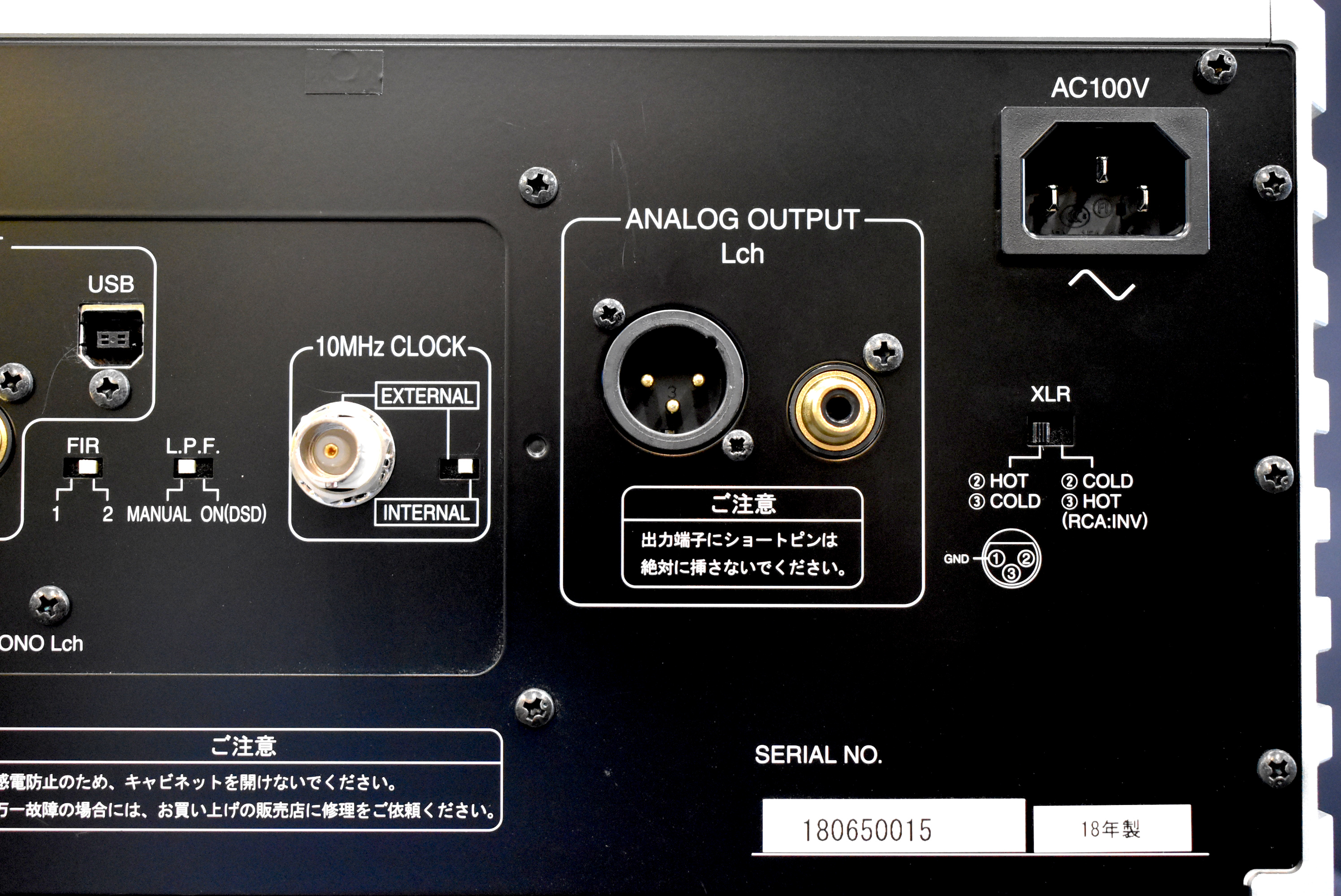 | 仕様 | ■入力フォーマット:USB/PCM,DSD(DoP v1.1、ASIO、ネイティブ)、同軸・AES/EBU:PCM、DSD(DoP v1.1) ■対応サンプリング周波数:USB/最大768kHz (PCM) 最大22.6MHz (DSD)、同軸・AES/EBU:最大192kHz (PCM) 2.8MHz (DSD64 DoP v1.1) ■PCM量子化ビット数:USB/16bit,24bit,32bit、同軸・AES/EBU/16bit,24bit ■デジタル入力:USB (B Type)、同軸 2系統(SPDIF)、AES/EBU ■アナログ出力:XLR 1系統、RCA 1系統 ■アナログ出力レベル:XLR/5.6Vrms、RCA/2.8mVrms ■周波数特性:2Hz~120kHz(+0/-1dB) ■S/N比:110dB ■全高調波歪率:0.008%(NOS/176.4kHz) ■付属品:スパイク、電源ケーブル ■消費電力:56W |